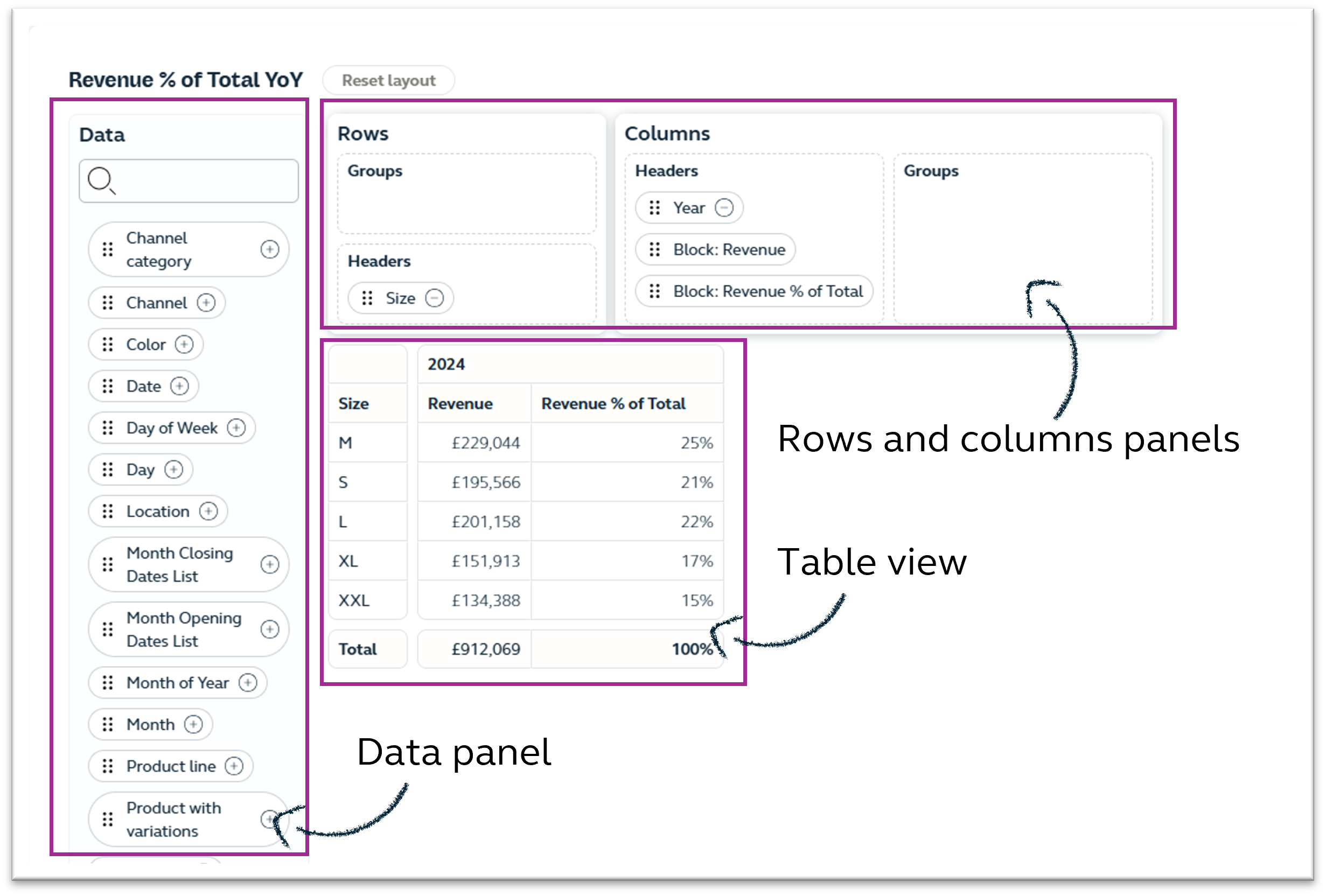 Table layout mode allows you to edit the layout of the table to analyze your data in different ways, enabling you to easily extract insights from your data. Changes to table layout are personal to you - other users will not see your changes.